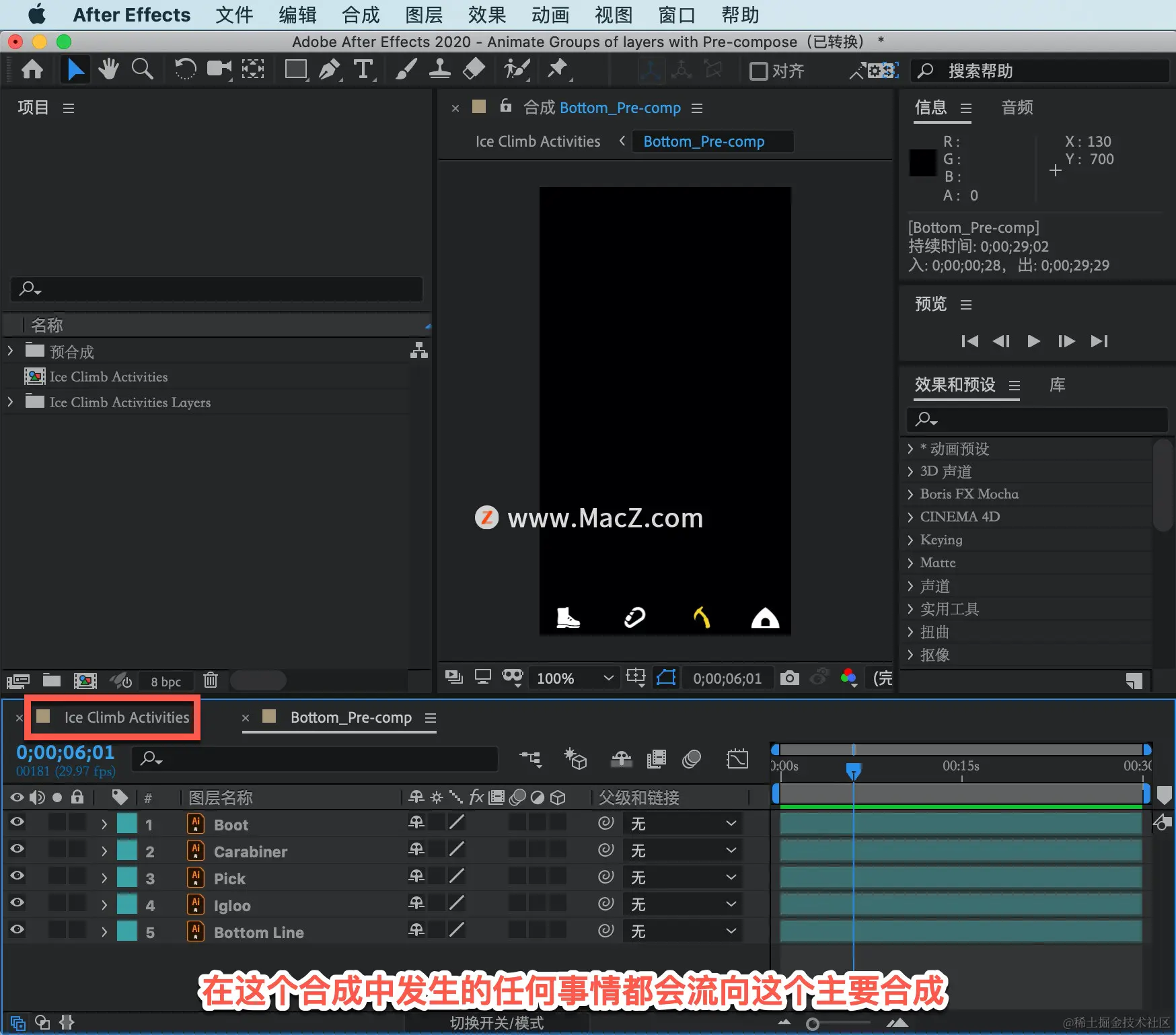 欢迎观看 After Effects 教程,小编带大家学习 After Effects 的基本工具和使用技巧,了解如何在 AE 中使用预合成对图层组进行动画绘制。
