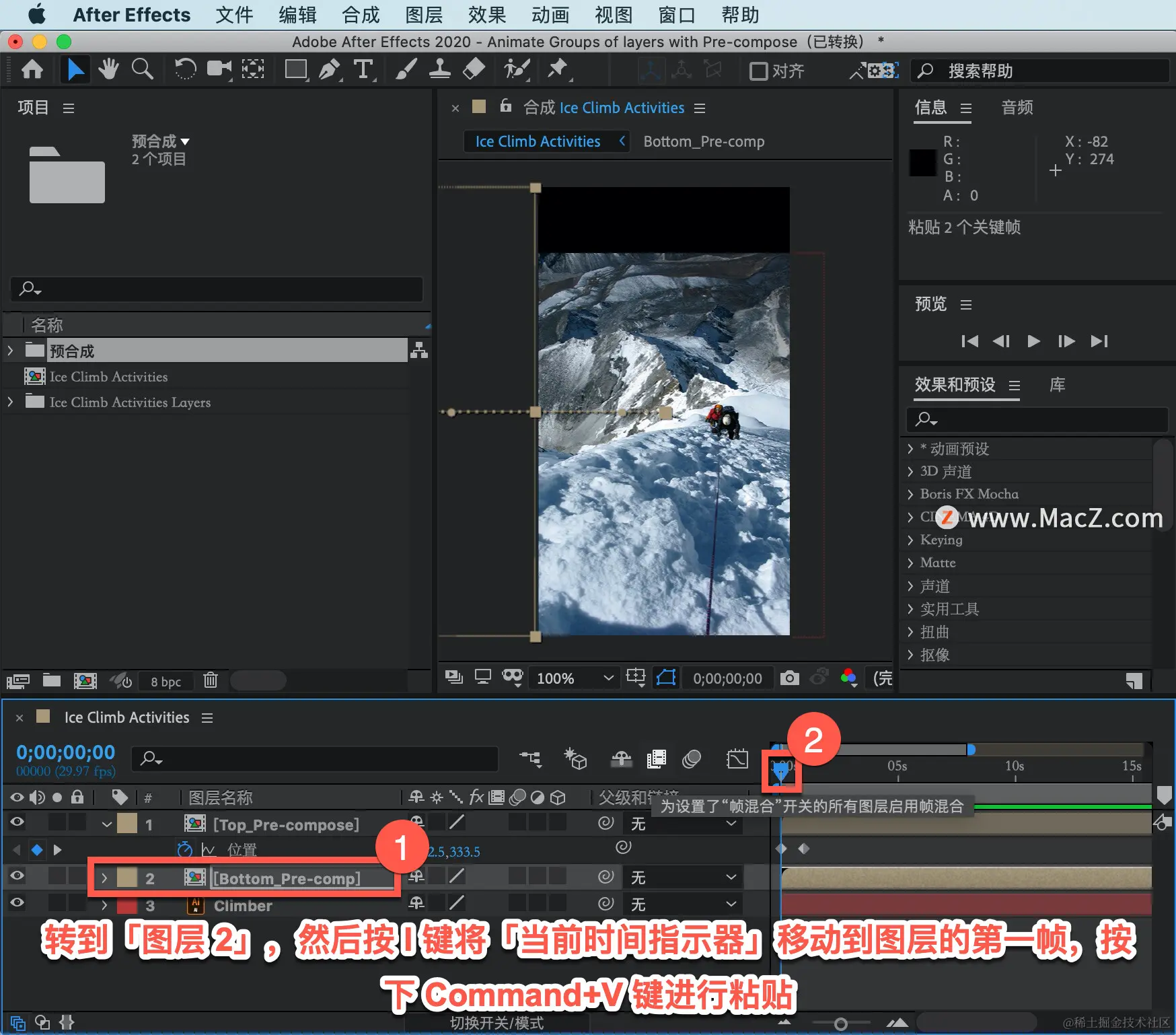 转到「图层 2」,然后按 I 键将「当前时间指示器」移动到图层的第一帧,按下 Command+V 键进行粘贴。