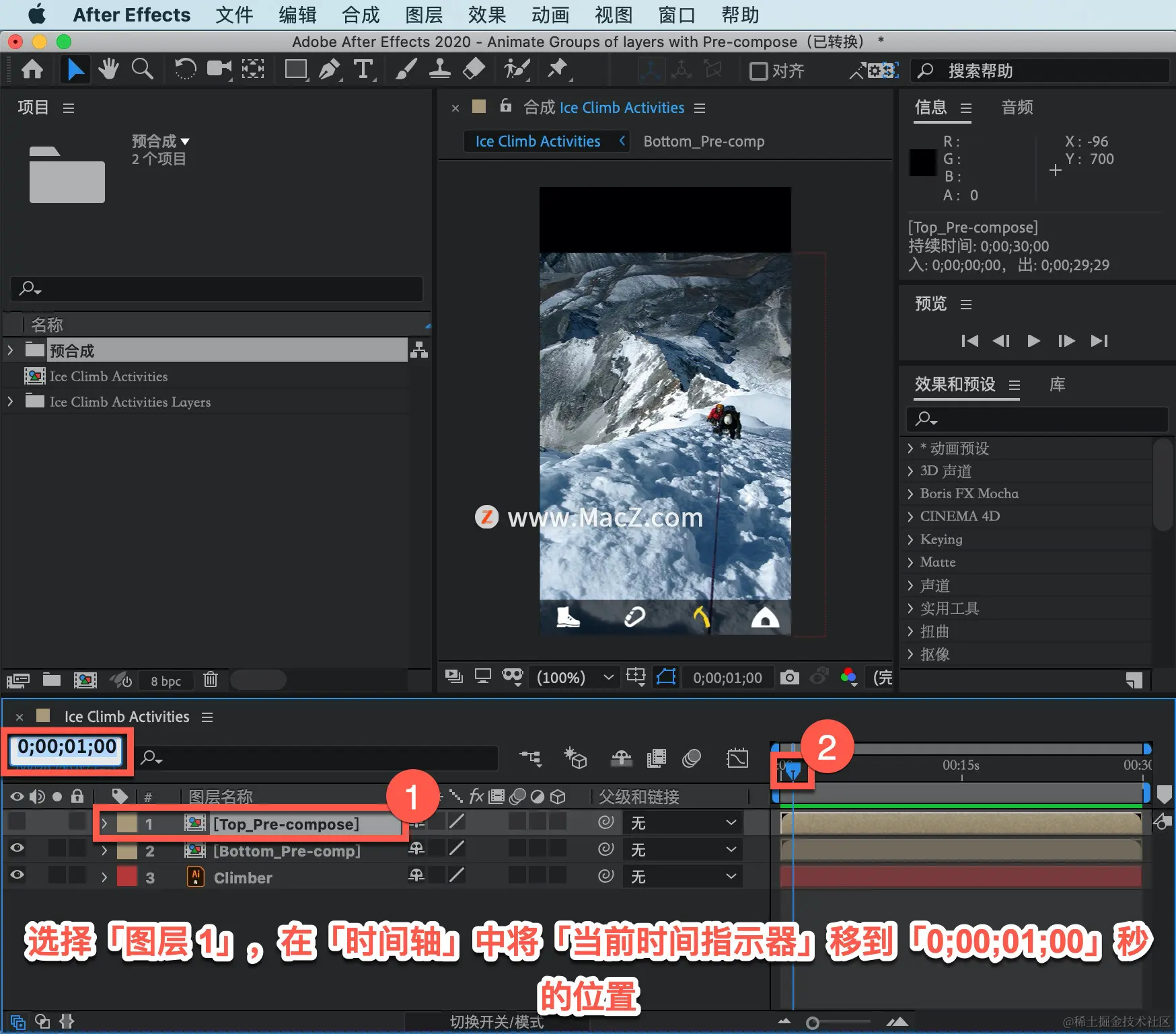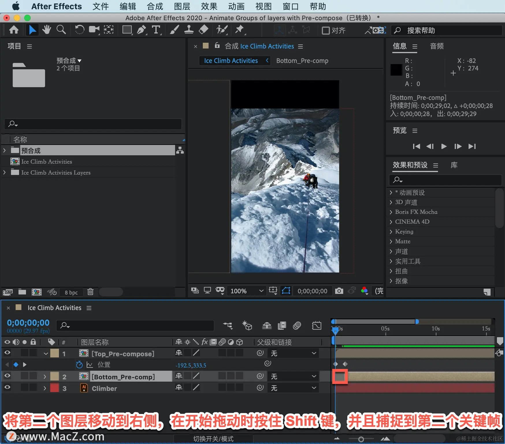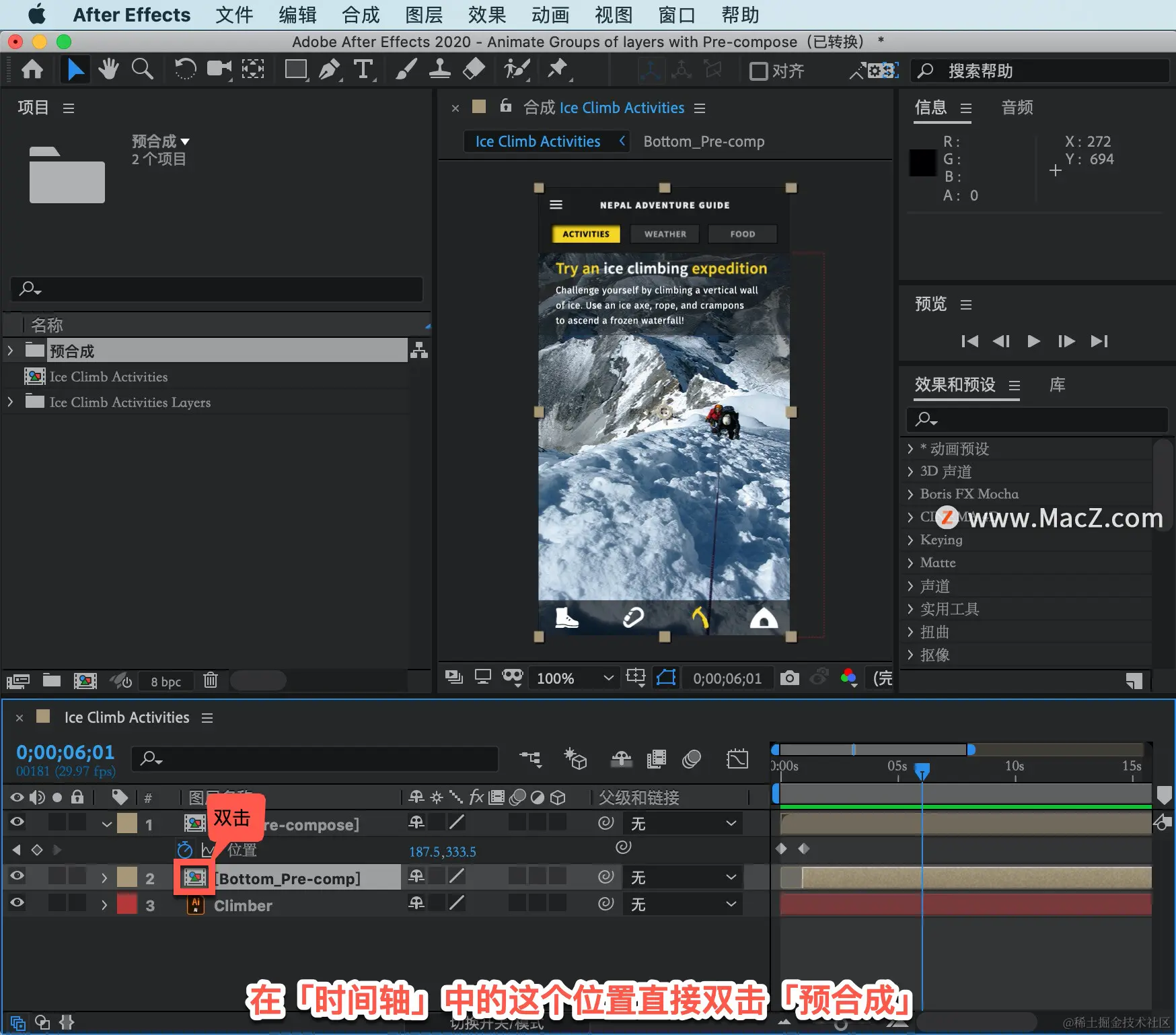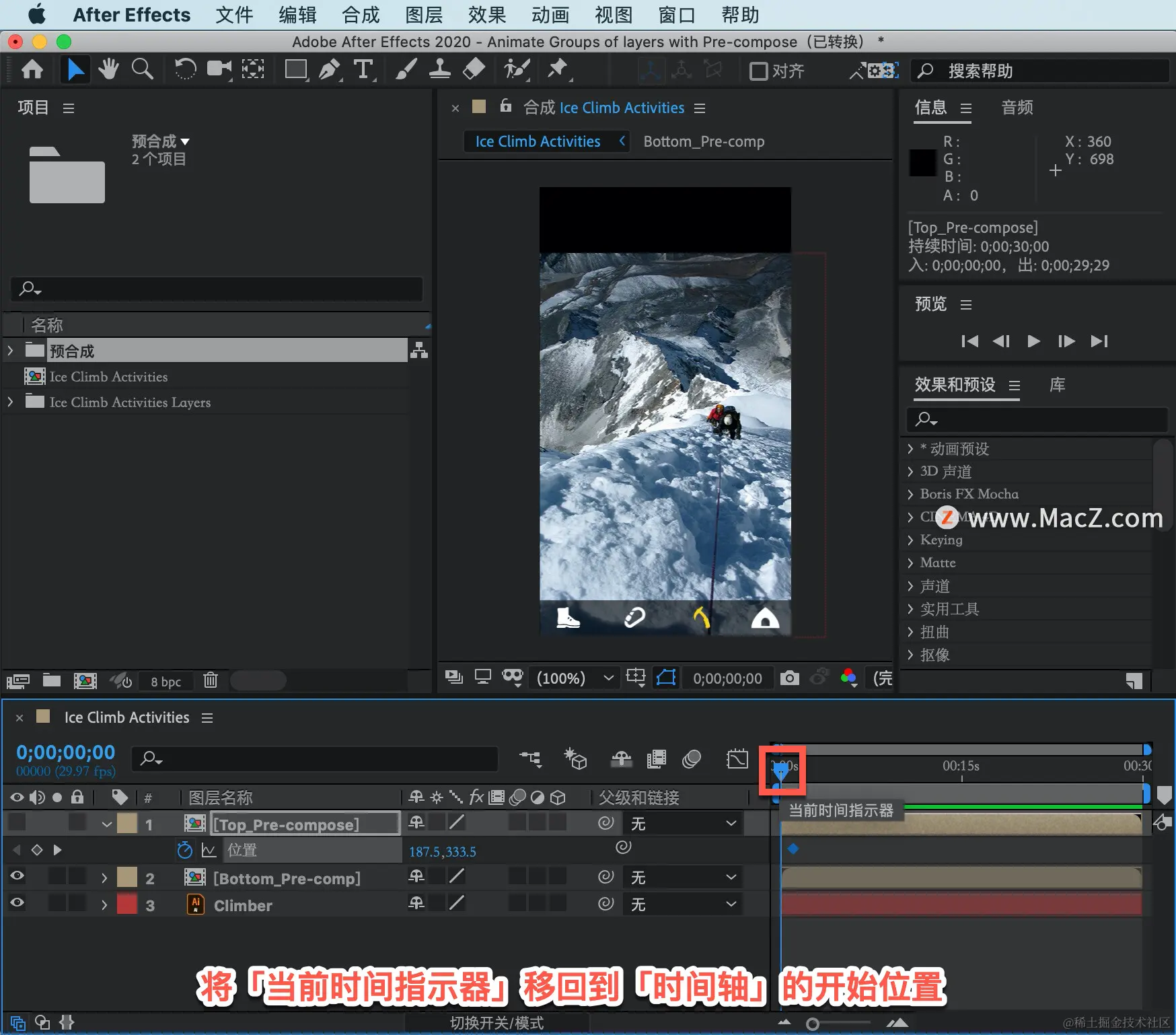 按空格键停止播放,如果打开「图层2」,只需在「时间轴」中的这个位置直接双击「预合成」,便会自动打开这个预合成。
