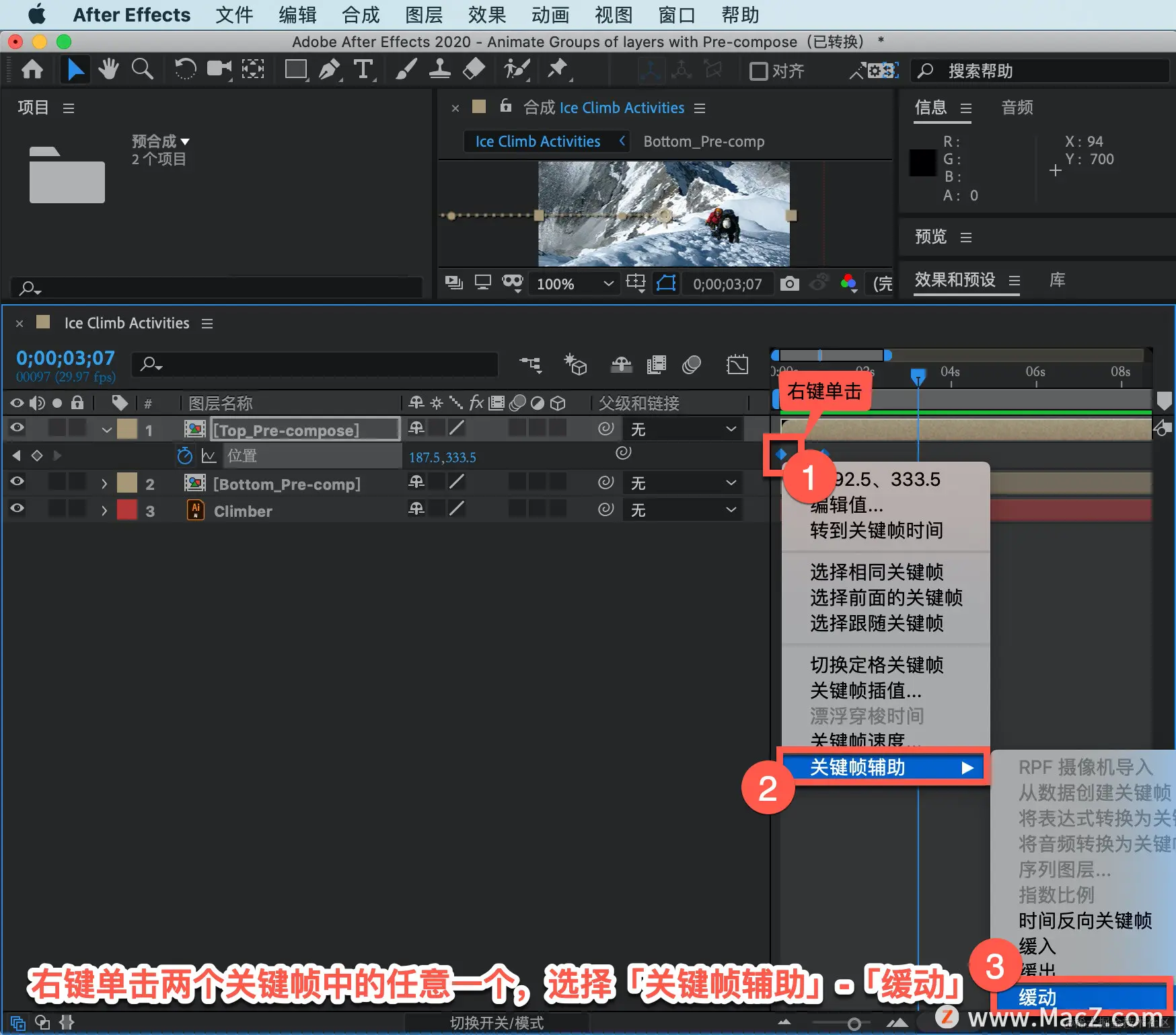 继续操作,右键单击两个关键帧中的任意一个,选择「关键帧辅助」-「缓动」。
