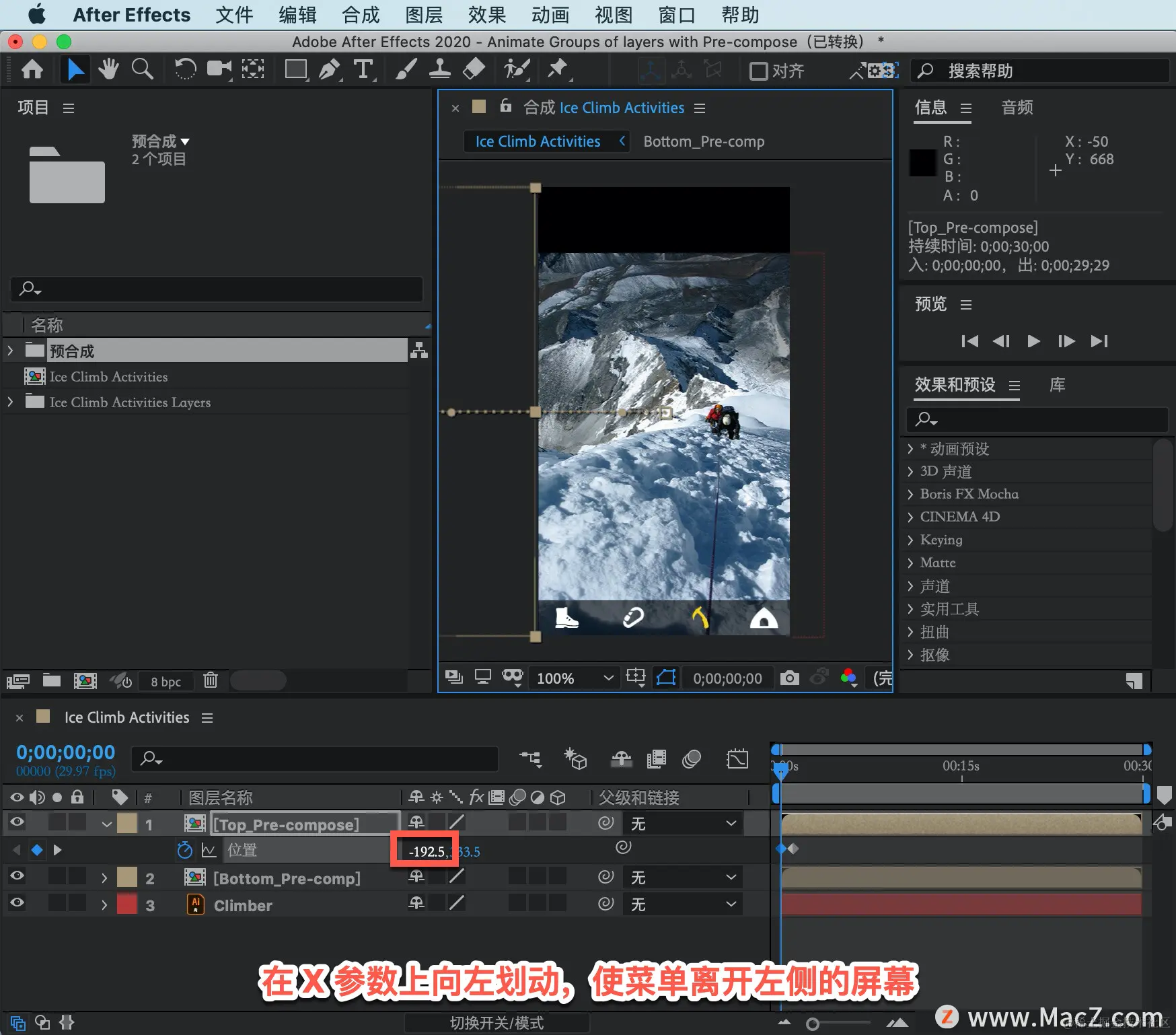 在 X 参数上向左划动,使菜单离开左侧的屏幕。按下空格键,会看到它是一个线性的动画。