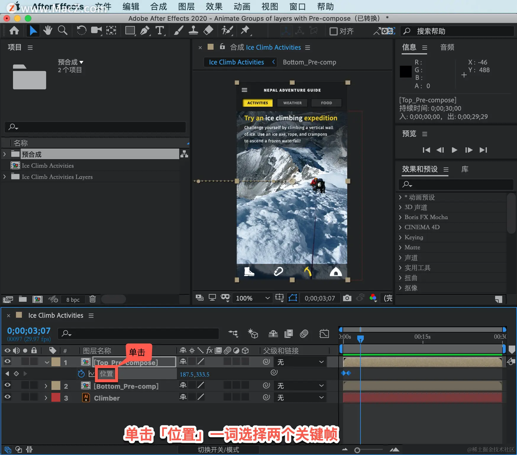再次按空格键停止播放,然后单击「位置」一词选择两个关键帧。
