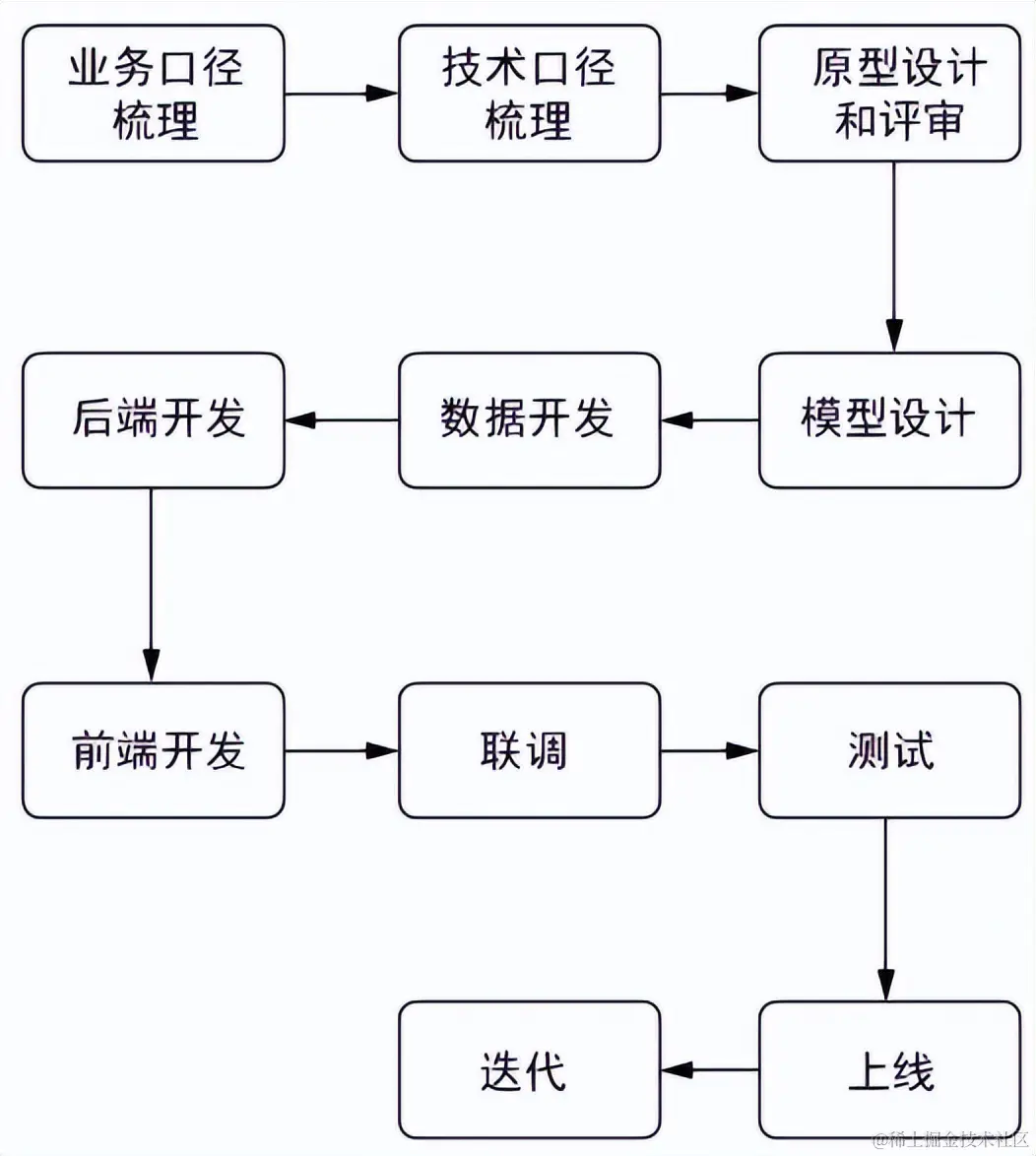 数据中台开发流程一共有11个步骤:业务口径梳理、技术口径梳理、原型设计和评审、模型设计、数据开发、后端开发、前端开发、联调、测试、上线、迭代。接下来我们分析这些步骤都是做什么的: