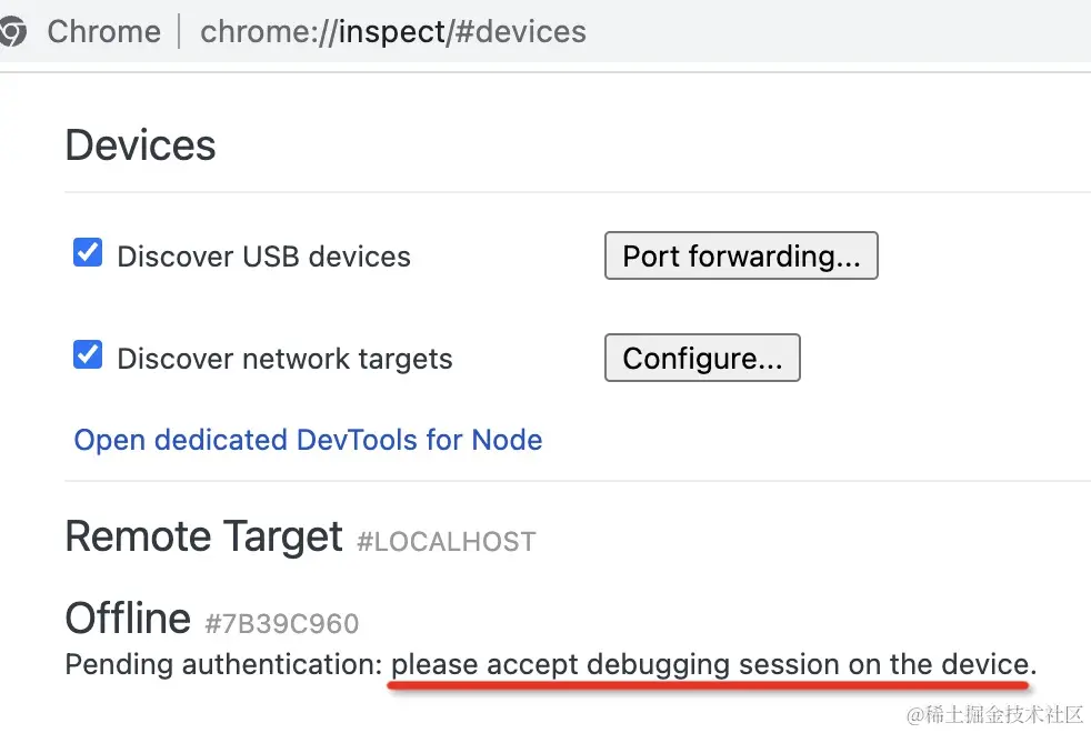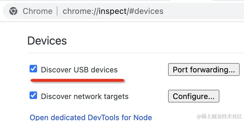 然后在 chrome 打开 chrome://inspect 页面,勾选 Discover USB devices(默认是勾选的):