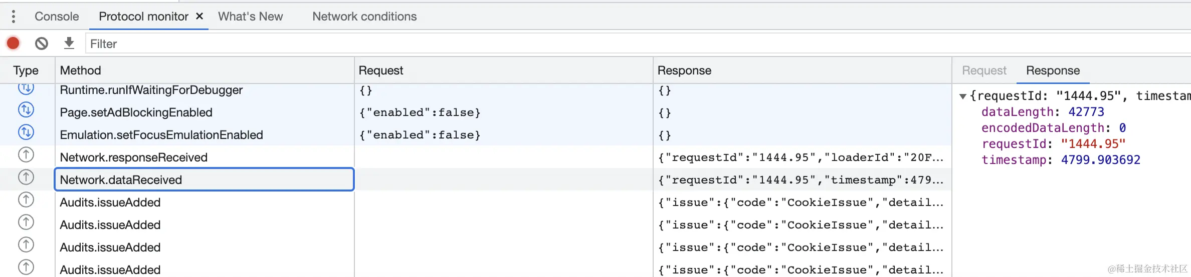 然后你就可以在 Protocol Monitor 面板里看到所有的 CDP 协议的数据交互了: