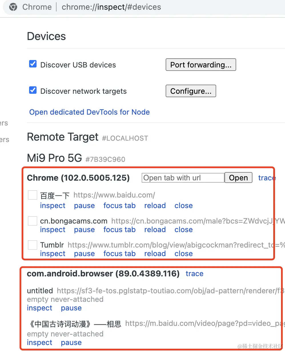 打开 USB 调试之后,在 chrome://inspect 页面就可以看到可调试的网页了,点击对应的网页就可以调试。