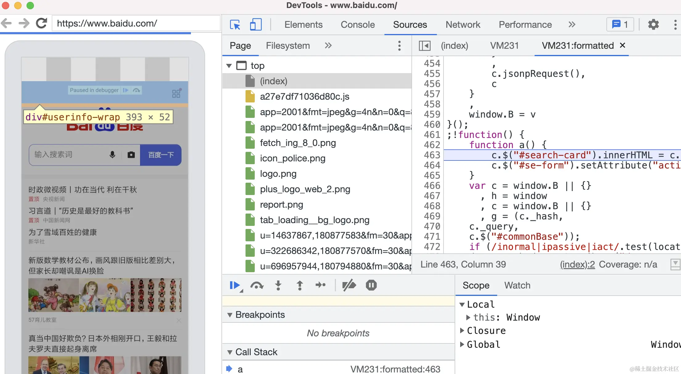 要注意的是调试的目标浏览器要和用的 Chrome DevTools 版本一一对应才行,所以第一次调试会先下载 Chrome DevTools,这需要访问 google 的域名,如果没有科学上网,会有白屏和 404 的问题。