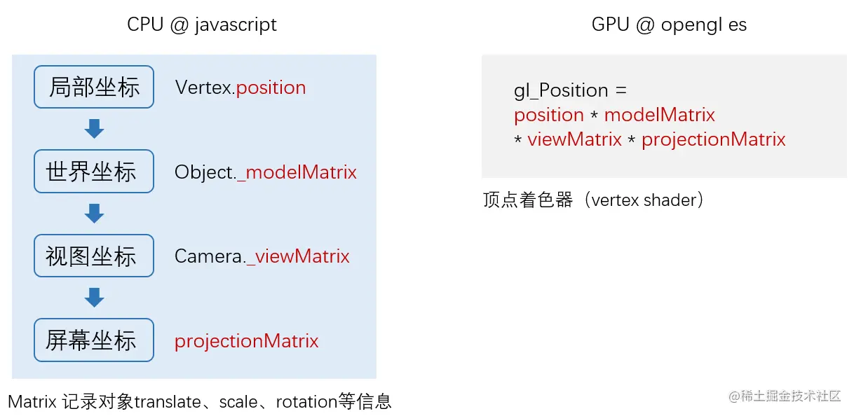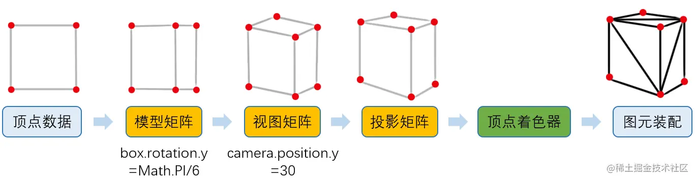 我们引入了一个新的名词,叫“顶点着色器”,它由opengl es编写,由javascript以字符串的形式定义并传递给GPU生成。