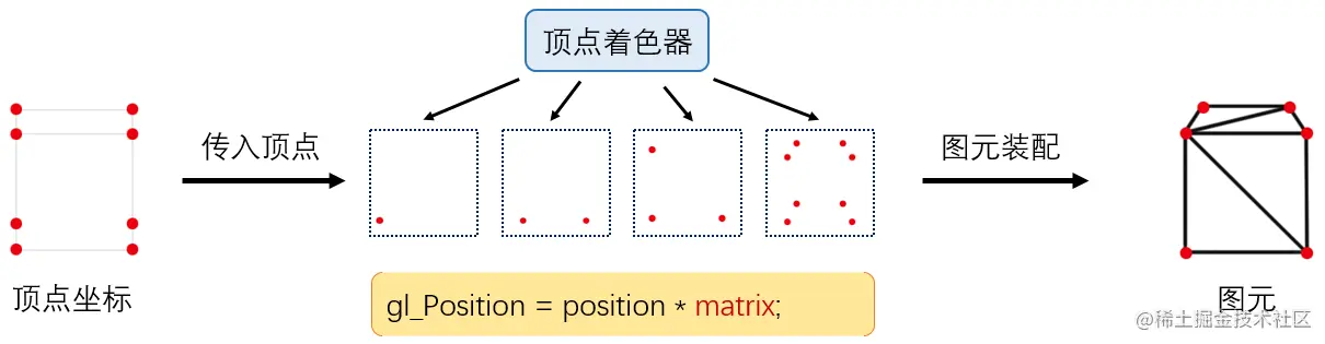 如上图,顶点着色器会先将坐标转换完毕,然后由GPU进行图元装配,有多少顶点,这段顶点着色器程序就运行了多少次。