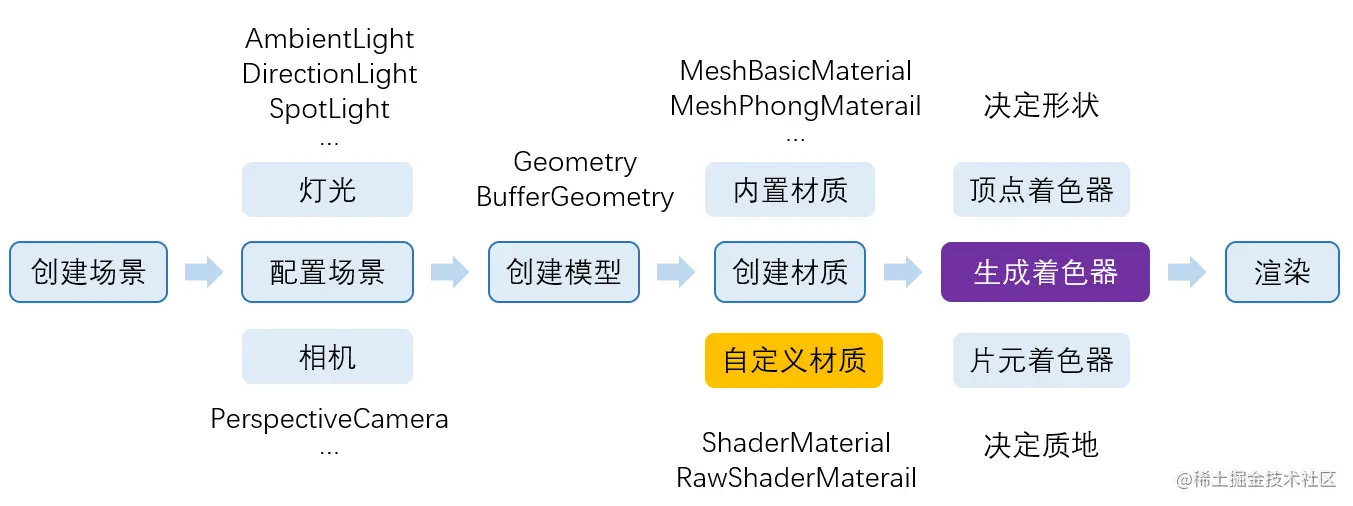 当我们选择材质后,three.js会根据我们所选的材质,选择对应的顶点着色器和片元着色器。