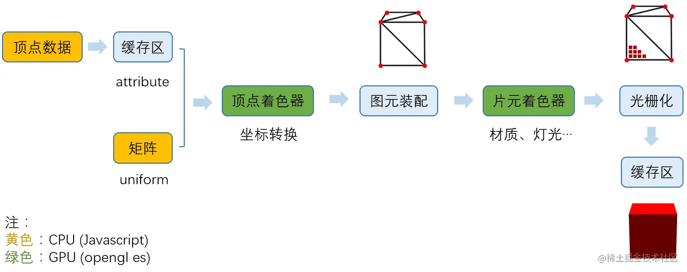 至此,实质上,WebGL经历了如下处理流程: