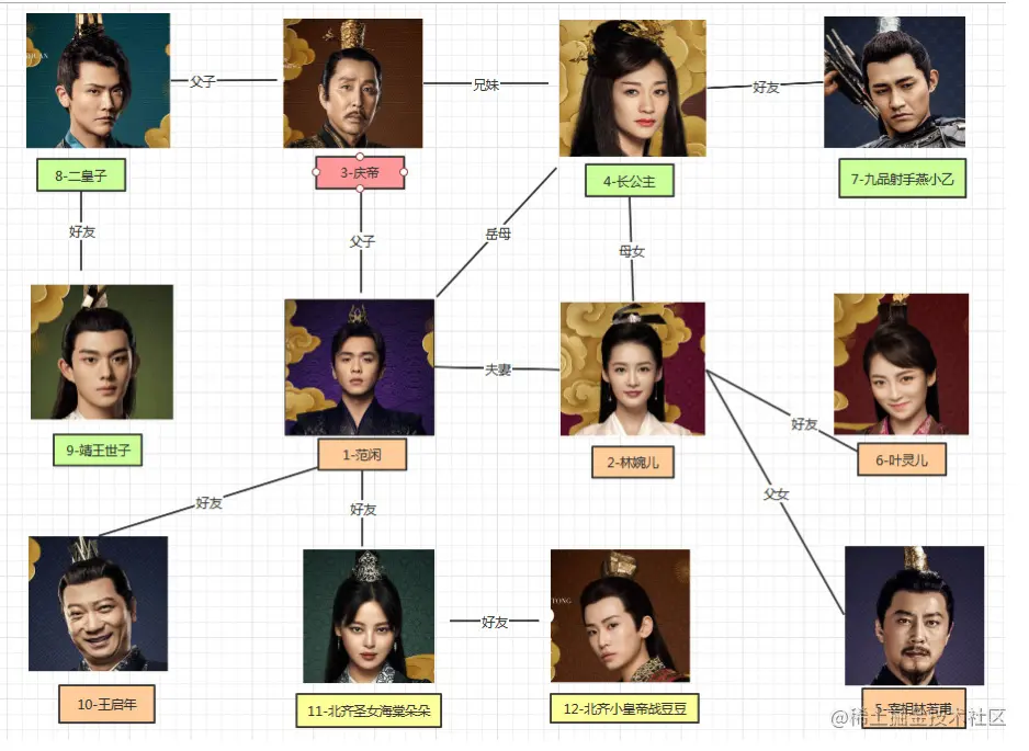 我们用庆余年这部剧里面的角色和关系来举例: