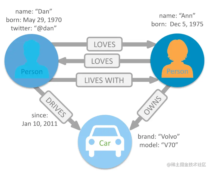 - 关系总是有一个方向、一个类型、一个开始节点和结束节点,并且它们也可以有属性