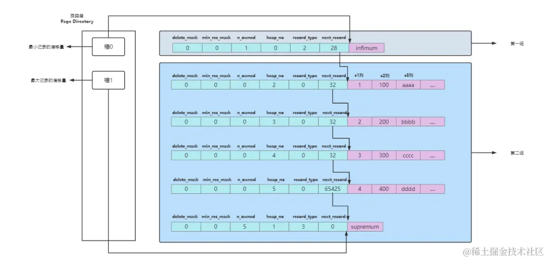 而每个数据页中的记录可以通过主键值从小到大通过记录头的next_record属性形成一个单链表,为了高效查询每个单链表又被分为若干组,每个组的最大主键值的偏移量就会组成一个页目录,通过主键查找某条记录就可以采用二分法快速定位到某个对应的槽,快速查找,结构图如下所示。