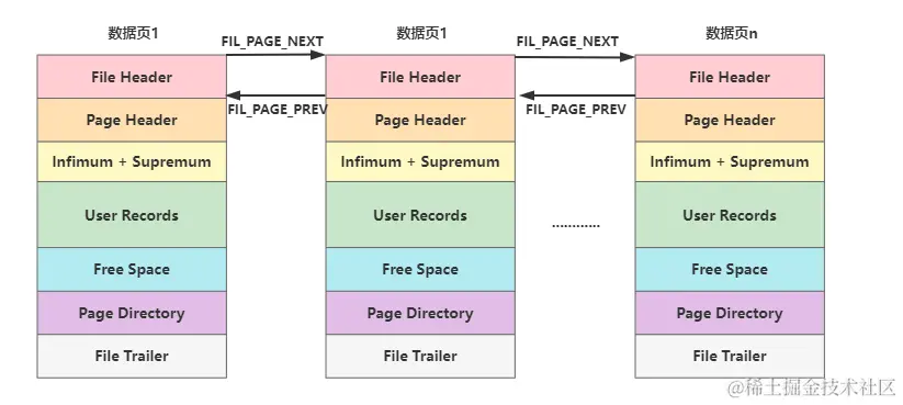 通过之前的文章我们知道InnoDB用于存储业务数据的页被称为数据页,而数据页的7大结构中的File Header结构中有上一页(FIL_PAGE_PREV)下一页(FIL_PAGE_NEXT)用来关联不连续的数据页,所以就可以形成如下所示的双向链表。