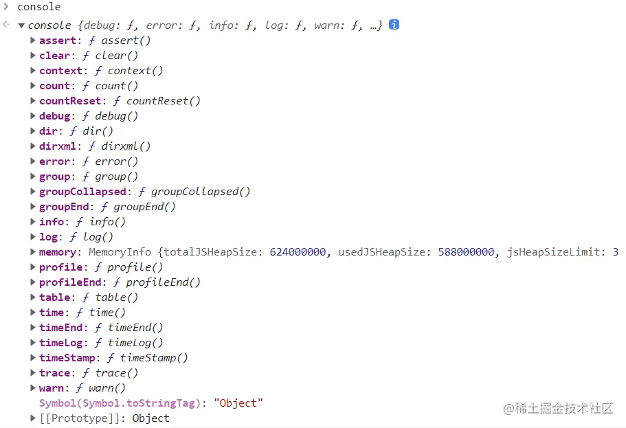 - console.dir:在控制台中显示指定JavaScript对象的属性,并通过类似文件树样式的交互列表显示。