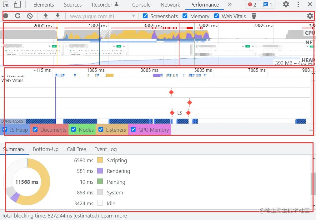 在 Performance 面板可以查看页面加载过程中的详细信息,比如在什么时间开始做什么事情,耗时多久等等。有人会问,这个跟上面的 Network 有什么区别呢,上面也能显示耗时信息。在 Performance 面板中,你不仅可以看到通过网络加载资源的信息,还能看到解析 JS、计算样式、重绘等页面加载的方方面面的信息。