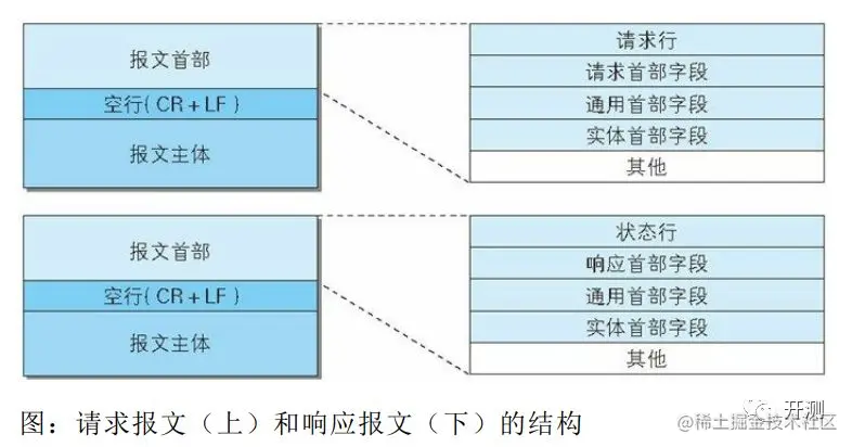 一次http过程分为请求和响应,相应的HTTP协议也对应分成两部分,请求报文和响应报文。