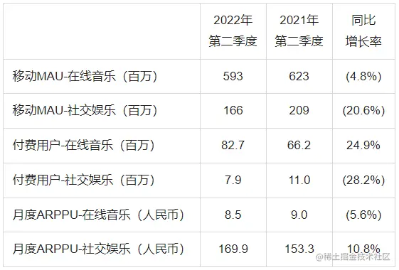- 2022年第二季度,尽管公司推广费用的降低导致了当季的在线音乐移动MAU同比有所下降,但得益于公司持续拓展的营销渠道、高质量的音乐内容与服务以及忠诚的核心用户群体,公司的在线音乐付费用户持续增长;同时,由于更温和有效的促销手段,公司的在线音乐ARPPU环比回升,进一步驱动公司的在线音乐订阅收入实现了强劲的同比和环比增长。