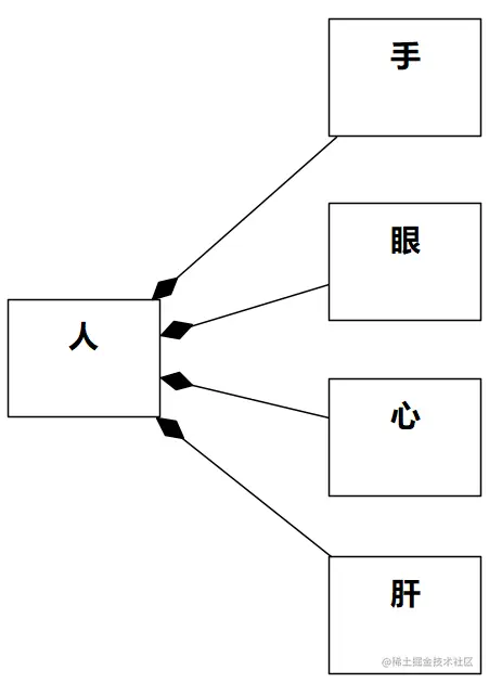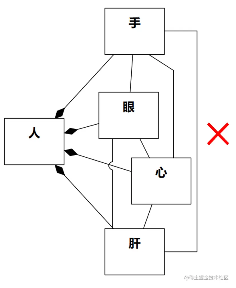 手、眼、心、肝这些部件和整体对象存在关联(组合关联),但它们之间并不需要存在关联,像图6这样: