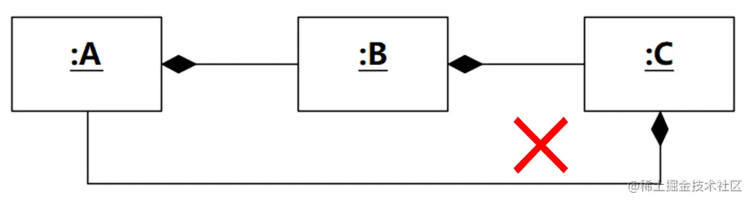 这意味着组合(聚合)是非对称的:如果对象B是对象A的部分,那么对象A不能直接或间接成为对象B的部分。