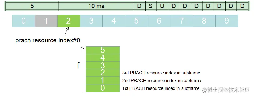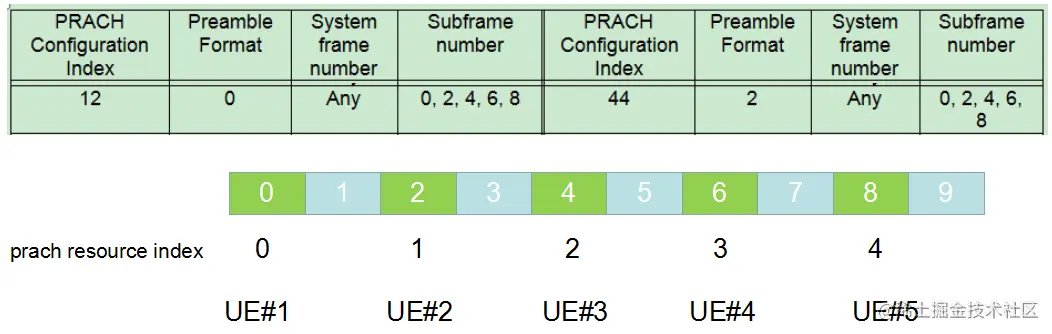 例如FDD-LTE下,PRACH Configuration Index配置为12,通过36.211中表格Table 5.7.1-2可知,PRACH资源分配在无线帧内的子帧0,2,4,6,8,prach resource index则对上述子帧位置进行编号。