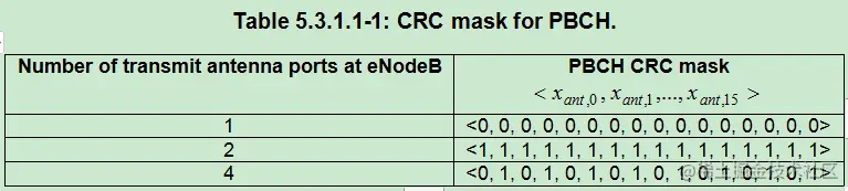在LTE中,在PBCH信道的处理中,也有一处使用了mask,对于天线口数1,2,4分别对应了3种CRC mask,不同的天线口数分别使用该3种CRC mask与CRC结果进行异或。
