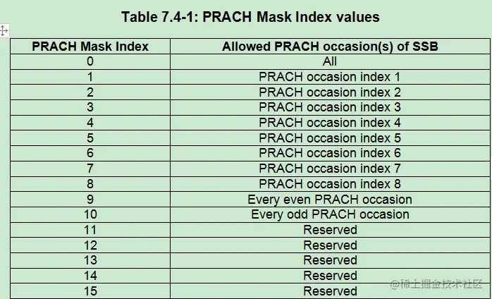 PRACH Mask Index值对应的含义在38.321中的Table 7.4-1中。