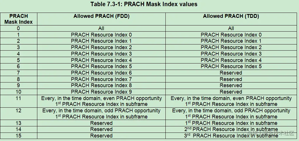 对于TDD-LTE,除了在时间位置上的区分外,由于PRACH在子帧内还存在频域复用,因此还可以指示子帧内的频域资源索引,即PRACH mask Index值为11~15区间所示。