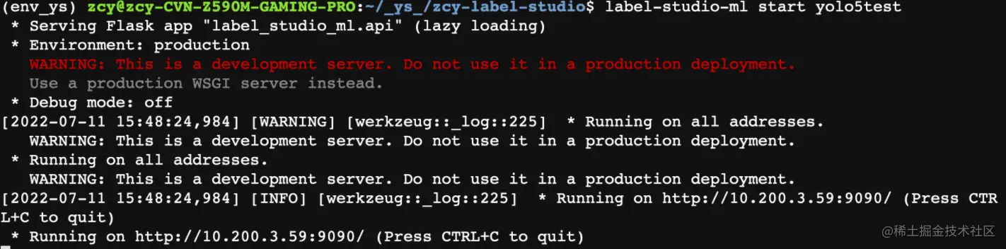 其中第一行命令为初始化ML后端,--script 为 ML 后端类的位置。第二行命令为启动 ML 后端。启动成功后会出现如下提示:
