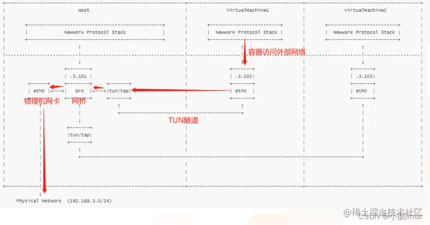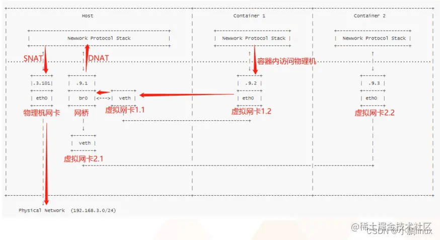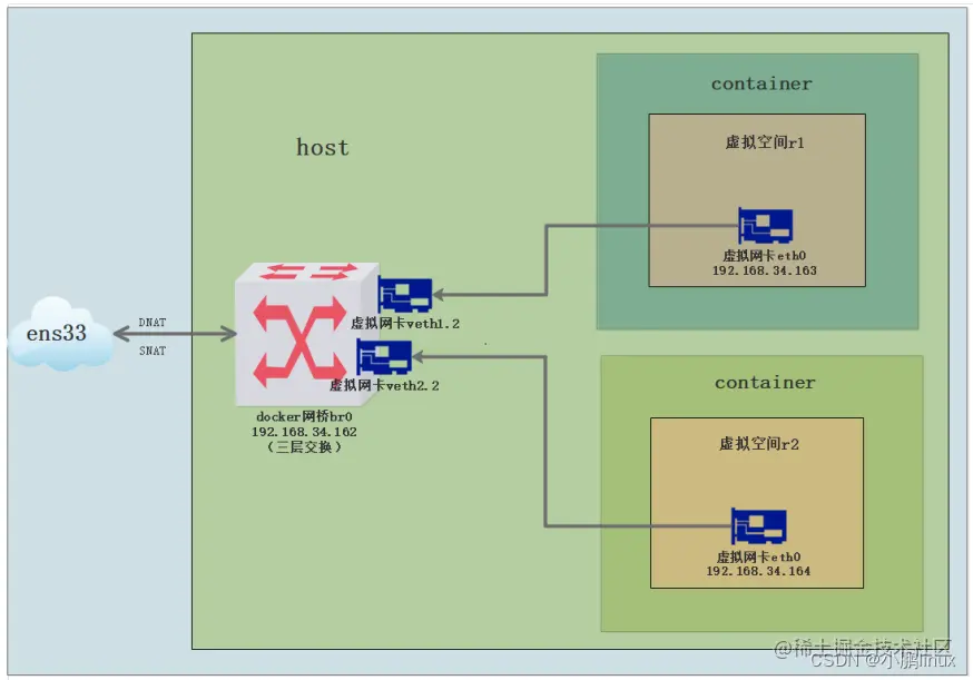 每个容器启动时会创建一对虚拟网卡,一个网卡在容器内的虚拟空间内,一个在主机的docker网桥上,然后网卡一连接网卡二,网卡二连接网桥。其他容器的虚拟网卡也都连接到网桥(三层交换)上,就可以使不同的容器之间互相通信了。