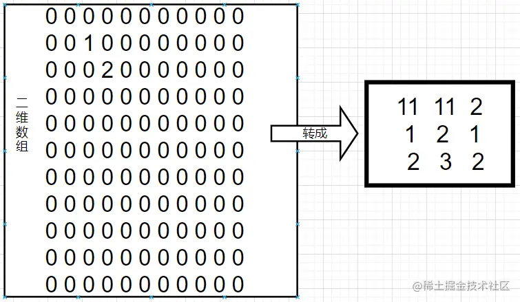 上面的图示中,左侧是二维数组,右侧是稀疏数组,将二维数组转成稀疏数组,明显的可以看出空间减少了,可以有效的节约空间,提高效率。那么二维数组怎么生成稀疏数组呢?其实很简单,因为二维数组有特定的格式,按格式将二维数组中的数据放入稀疏数组即可。