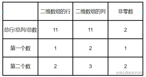 稀疏数组的列是固定的,只有三列,第一列表示二维数组的行,第二列表示二维数组的列,第三列表示二维数组非零数的个数。稀疏数组的第一行是固定的,用来表示总行数,总列数,总个数。其余行数根据个数而定。