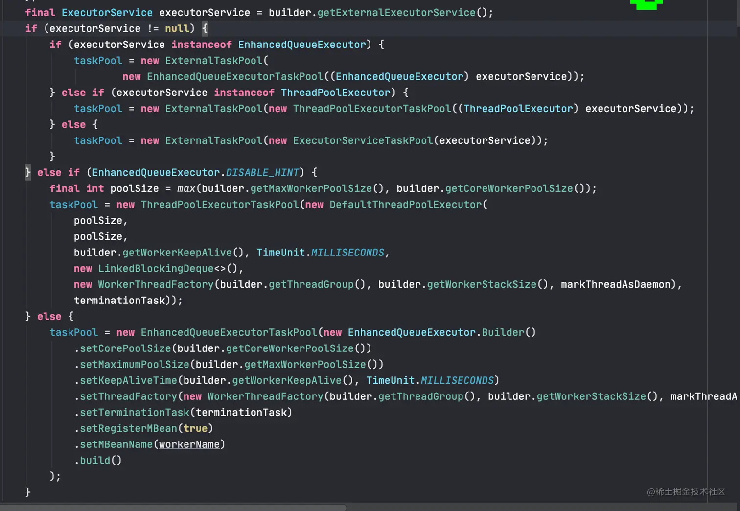 - 具体的创建代码如下,根据外部是否传入,如果有传入则用外部传入的类,如果没有,根据参数设置内部创建一个,具体是用 JUC 的 ThreadPoolExecutor 还是 Jboss 的 EnhancedQueueExecutor,根据配置参数选择