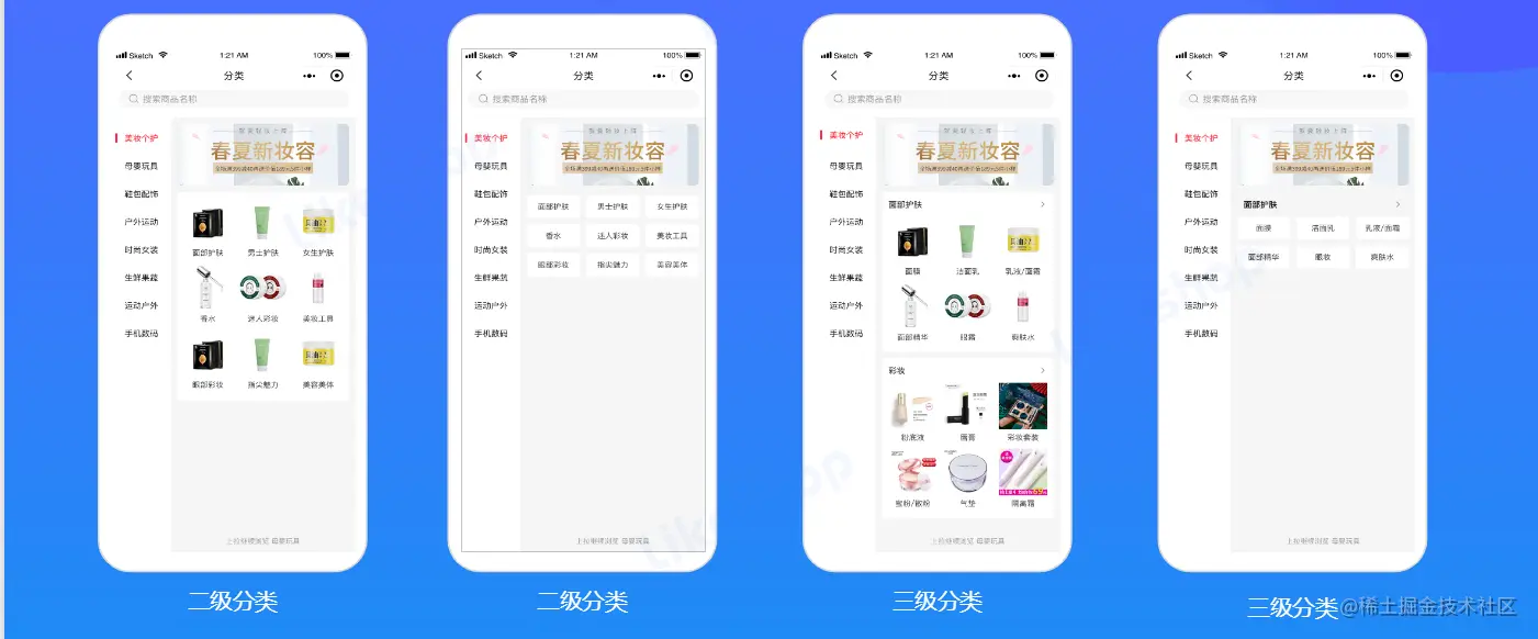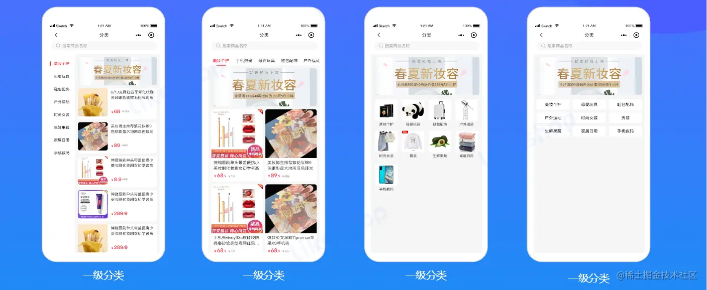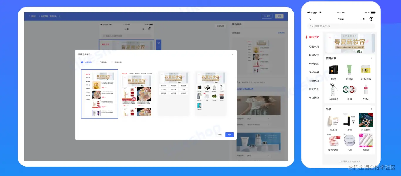 多种分类样式随意切换,适合不同的行业,包括生鲜、家装、美妆或者多类商城等