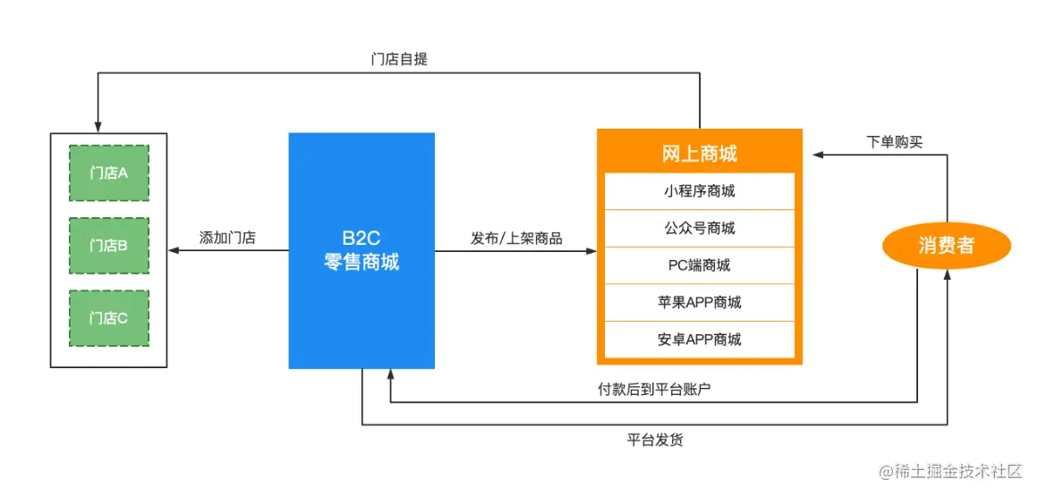 线下的门店可以在网上添加零售商城,网上商城有小程序商城、公众号商城、PC端商城、苹果app商城、安卓app商城等,在网上商城发布/上架所要出售的商品,消费者在平台下单购买后,可以选择平台发货,也可以选择到门店自提。
