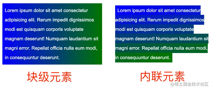 什么意思呢?区别很明显,块级元素的背景整体是一个渐变整体,而内联元素的每一行都是会有不一样的效果,整体连起来串联成一个整体。