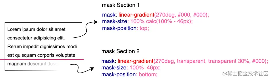 在下部分这块,我们利用 mask 做了从右向左的渐隐效果。并且利用了 mask-position 定位,以及 calc 的计算,无论文本都多少行,都是适用的!需要说明的是,这里的 46px 的意思是单行文本的行高加上 padding-bottom 的距离。可以适配任意行数的文本: