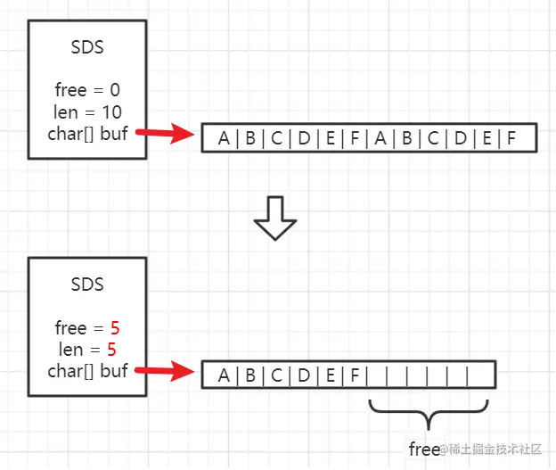 惰性空间释放用于优化 SDS 的字符串缩短操作:当 SDS 的 API 需要缩短 SDS 保存的字符串时,程序并不立即使用内存重分配来回收缩短后多出来的字节,而是使用 free 属性将这些字节的数量记录起来,并等待将来使用.