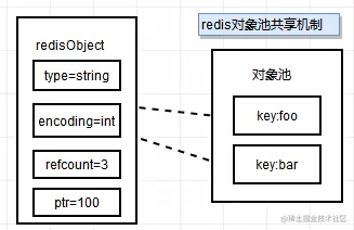 设置键 foo 等于 100 时, 直接使用共享池内整数对象, 因此引用数是 2, 再设置键 bar 等于 100 时, 引用数又变为 3.