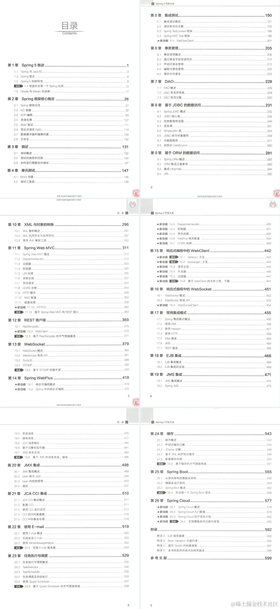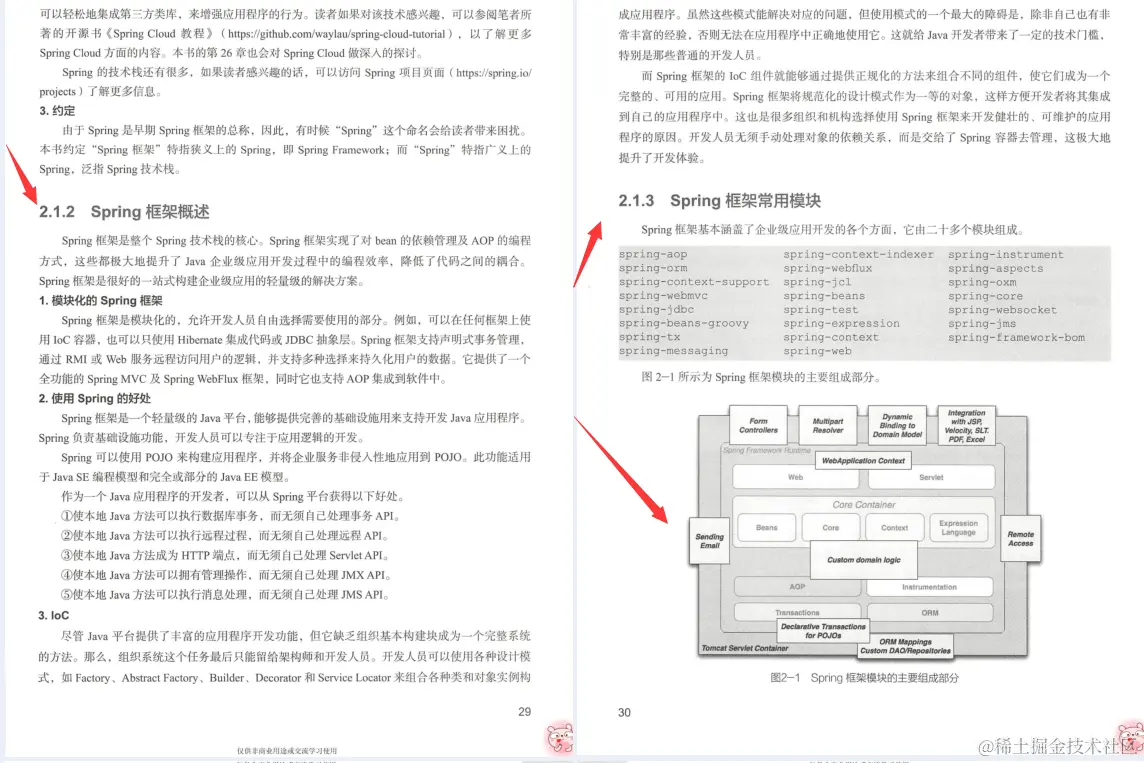 (1)全面:本书全面介绍Spring框架**+XXX_WWW666666获取**涵盖了Spring核心、测试、数据访问、系统集成、Web开发、响应式编程及微服务等方面在内的共26章的内容,可以说是Spring技术的“百科全书”。