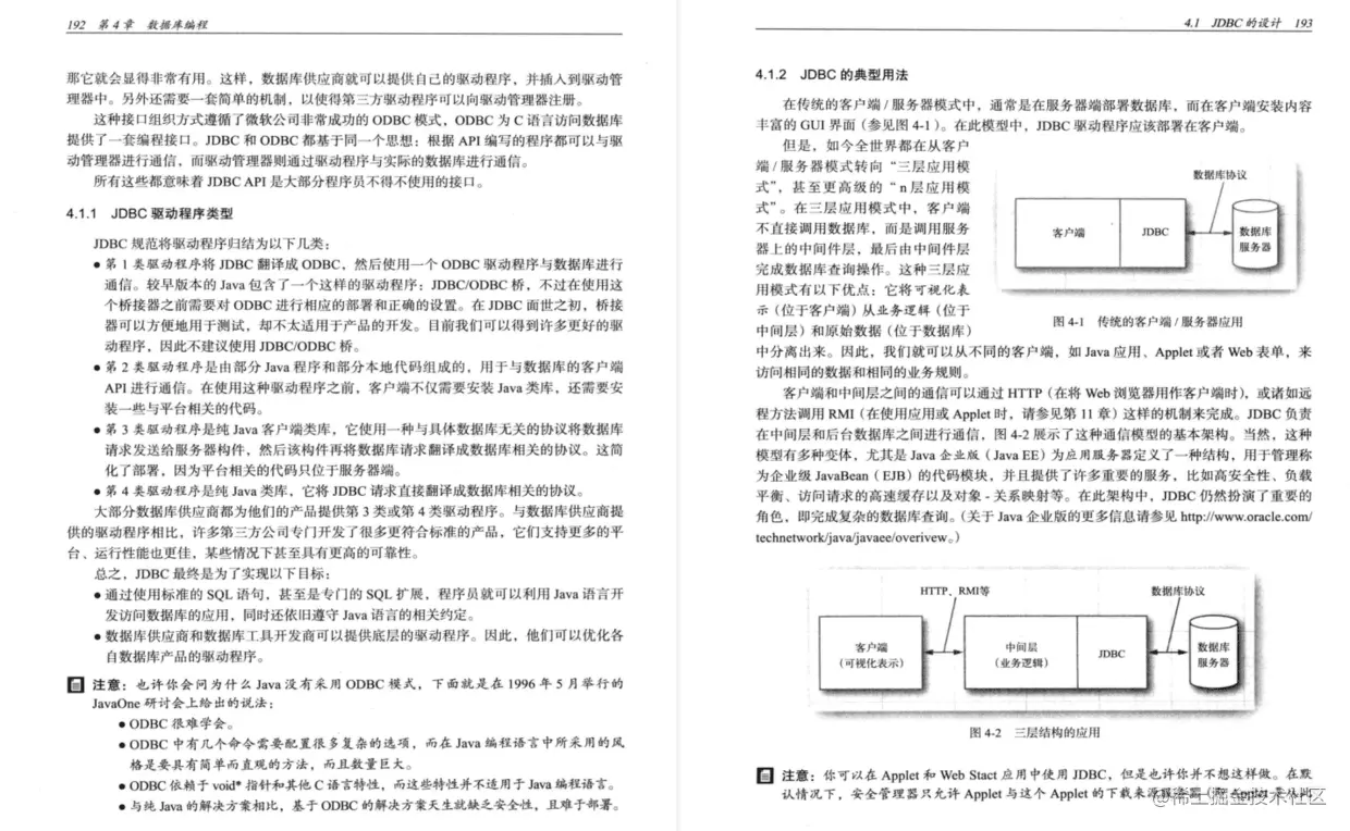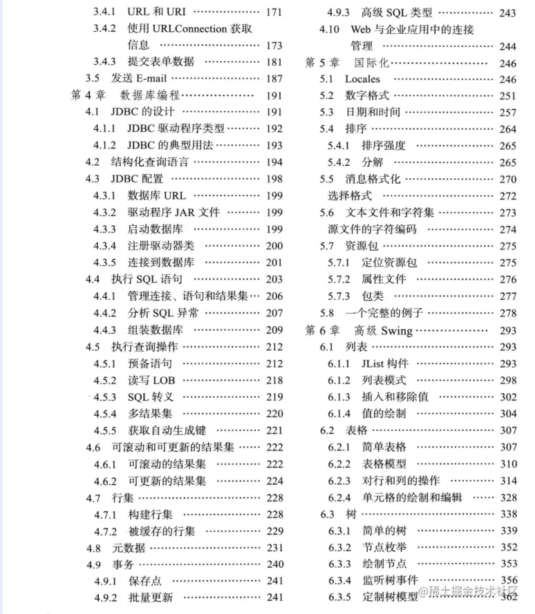 第4章介绍数据库编程,重点讲解JDBC,即Java数据库连接API,这是用于将Java程序与关系数据库进行连接的API。我们将介绍怎样通过使用JDBC API的核心子集,编写能够处理实际的数据库日常操作事务的实用程序。(如果要完整介绍JDBC API的功能,可能需要编写—本像本书一样厚的书才行。)最后我们简要介绍了层次数据库,探讨了一下JNDI(Java命名及目录接口)以及LDAP(轻量级目录访问协议)。