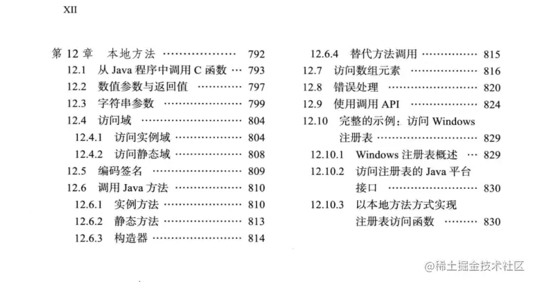 第12章介绍本地方法,这个功能可以让你调用为微软Windows API这样的特殊机制而编写的各种方法。很显然,这种特性具有争议性:使用本地方法,那么Java平台的跨平台特性将会随之消失。虽然如此,每个为特定平台编写Java应用程序的专业开发人员都需要了解这些技术。有时,当你与不支持Java平台的设备或服务进行交互时,为了你的目标平台,你可能需要求助于操作系统API。我们将通过展示如何从某个Java程序访问Windows注册表API来阐明这一点。