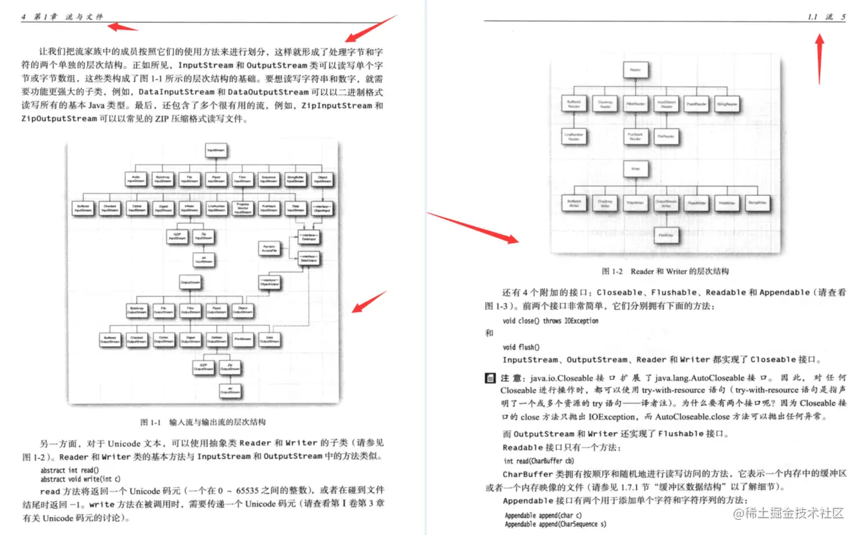 让我们把流家族中的成员按照它们的使用方法来进行划分,这样就形成了处理字节和字符的两个单独的层次结构。正如所见,InputStream和Outputstream类可以读写单个字节或字节数组,这些类构成了图1-1所示的层次结构的基础。要想读写字符串和数字,就需要功能更强大的子类,例如,DataInputStream和DataOutputstream可以以二进制格式读写所有的基本Java类型。最后,还包含了多个很有用的流,例如,ZipInputstream和zipoutputstream可以以常见的ZIP压缩格式读写文件。