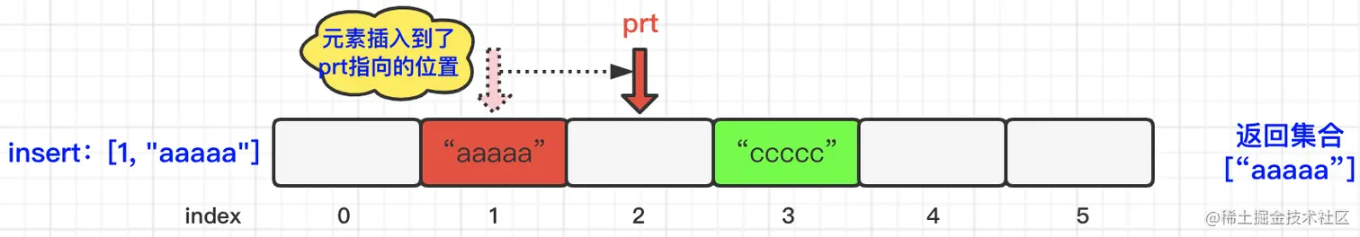 然后,我们再插入[1, "aaaaa"],由于此时prt等于1,元素插入到了prt指向的位置,所以,根据题意,我们返回["aaaaa"],同时prt指向加1操作,即:指向了下标为2的位置。由于下标为2的位置上没有插入过元素,所以,方法逻辑执行完毕,返回["aaaaa"]。具体操作如下图所示: