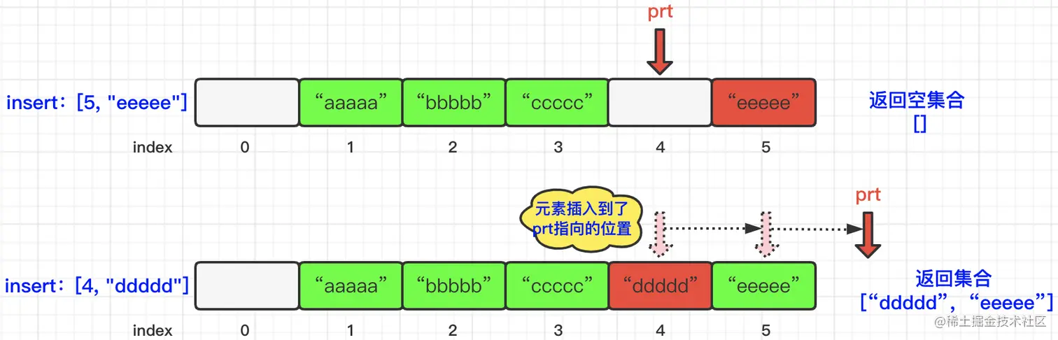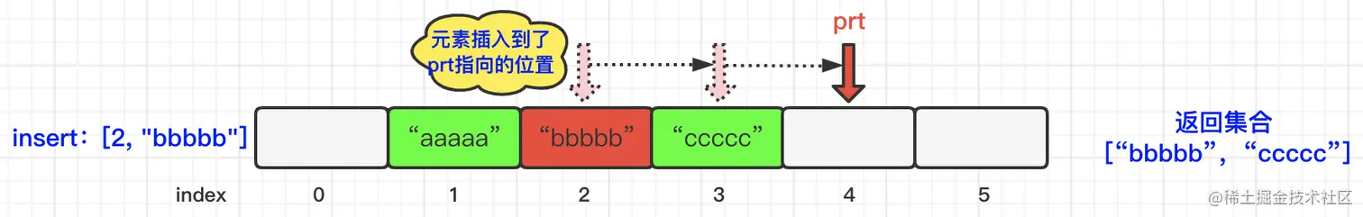 接下来,我们继续插入[2, "bbbbb"],由于此时prt等于2,元素插入到了prt指向的位置,所以,根据题意,我们返回["bbbbb"],同时prt指向加1操作,但是我们发现,prt指向的下标为3的位置上,已经存在元素“ccccc”了,所以,我们也将它一起作为返回值返回出去,此时prt再次执行加1操作,那么下标为4的位置上,元素是空的,所以,结束方法逻辑,返回["bbbbb", "ccccc"]。具体操作如下图所示: