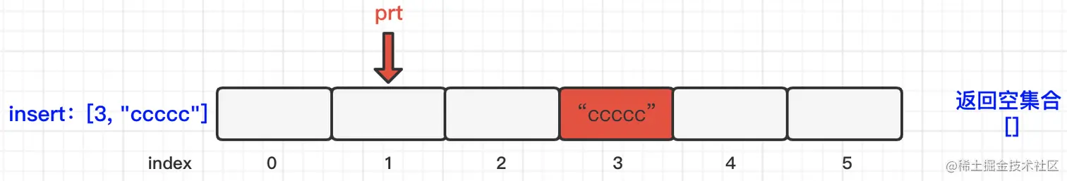 首先,我们创建一个长度为6的数组(即:n + 1),当插入[3, "ccccc"]时,由于index=3的位置上没有插入过其他元素,所以按照题意,直接返回空集合即可。由于prt现在指向1的位置,而插入位置是3,所以,prt不做任何变动。具体操作如下图所示: