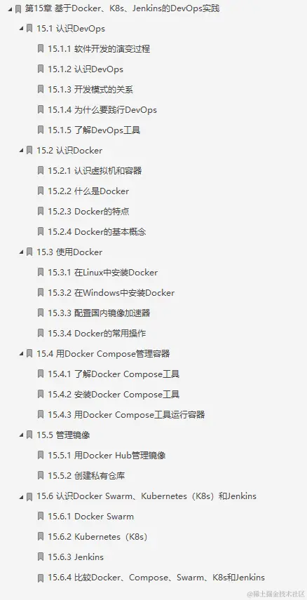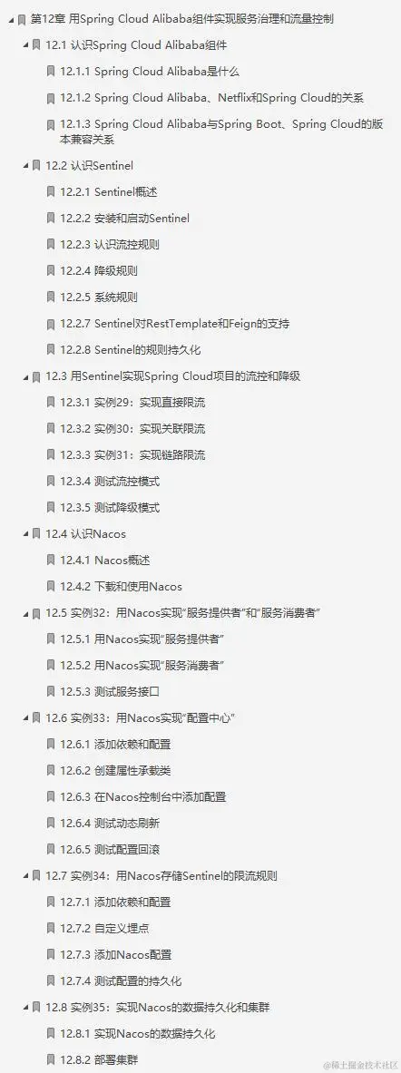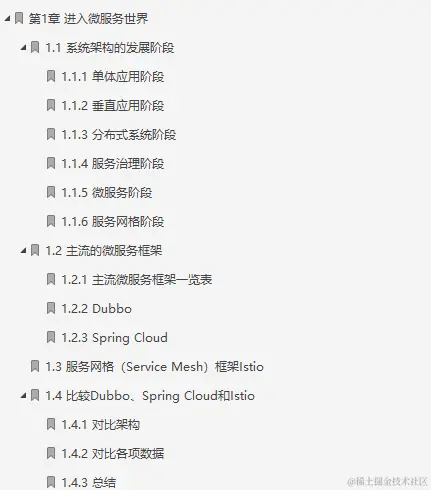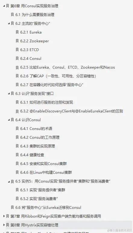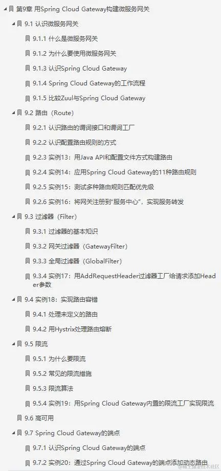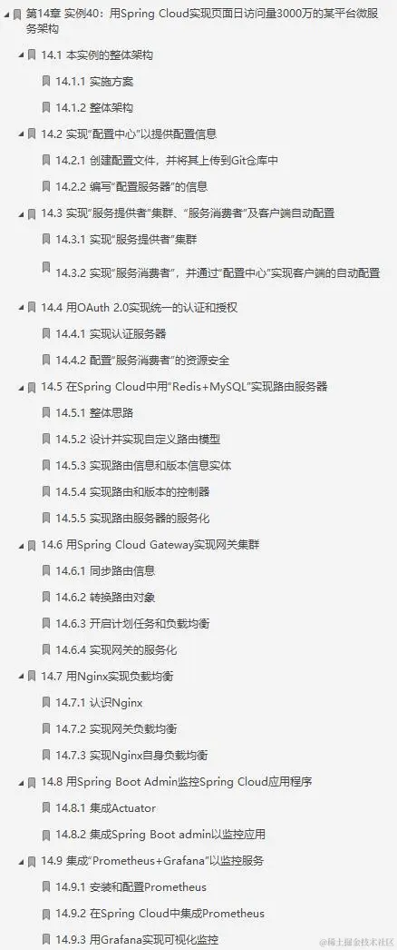这份阿里P9大牛的笔记一共是共分为15个部分:1进入微服务世界、2准备开发环境和工具、3用Spring Cloud实现一个微服务系统、4认识微服务、5Spring Cloud基础、6用Consul实现服务治理、7用Ribbon和Feign实现客户端负载均衡和服务调用、8用Hystrix实现容错处理、9用Spring Cloud Gateway构建微服务网关、10用Spring Cloud Sleuth实现微服务链路跟踪、11用Spring Cloud Config配置微服务、12用Spring Cloud Alibaba组件实现服务治理和流量控制、13用Spring Cloud Security实现微服务安全、14实例40:用Spring Cloud实现页面日访问量3000万的某平台微服务架构、15基于Docker、K8S、Jenkins的DevOps实践。