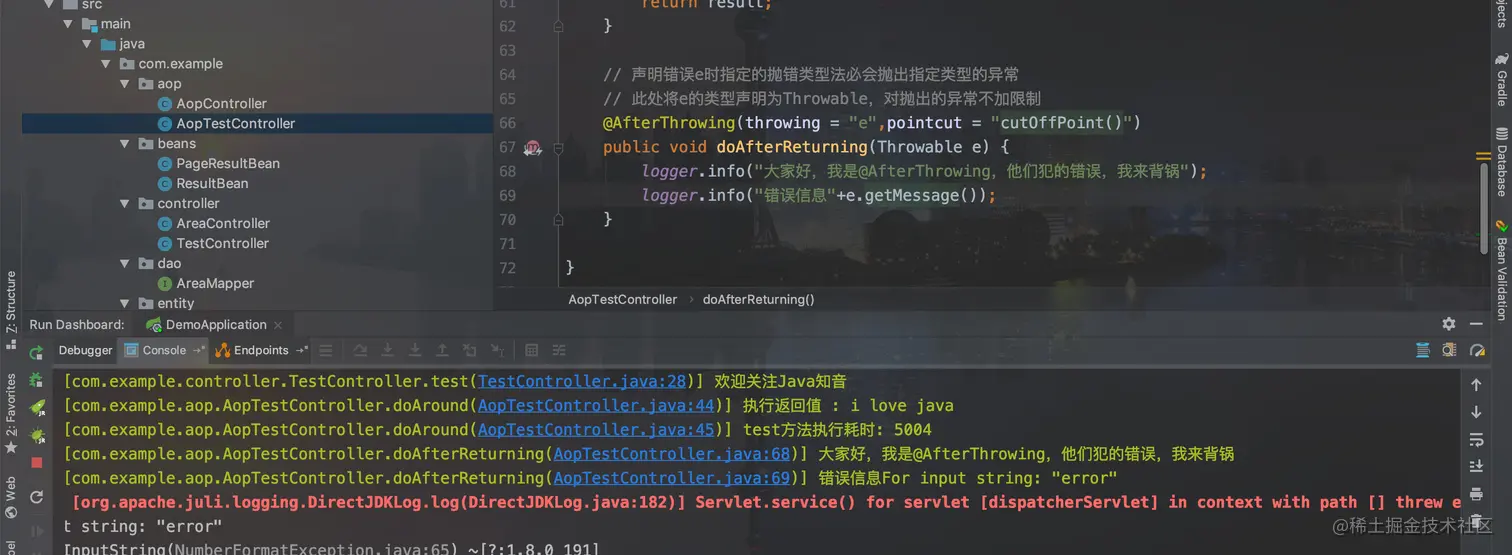 下面是@AfterThrowing的执行结果