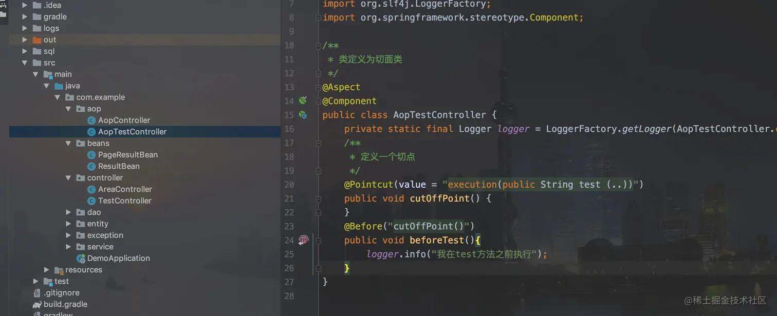 在之前的AopTestController类中加入对test方法的前置通知